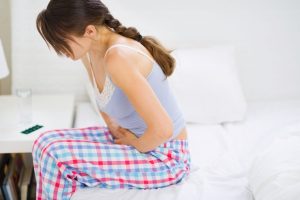 Girl with stomach ache sitting on bed